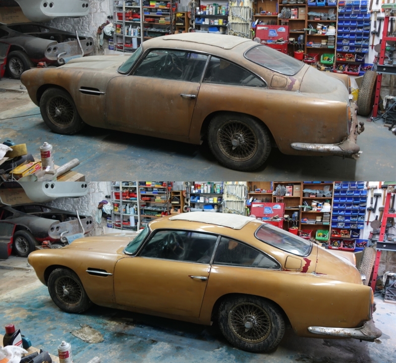 The Aston before and after having a rudimentary wash-down. It now not only runs, but drives too - having had several weeks of attention to things like the brake calipers, both master cylinders, water pump, new inner tubes, a carb rebuild, etc. It still needs a body-off restoration, but at least it looks less of a heap now!